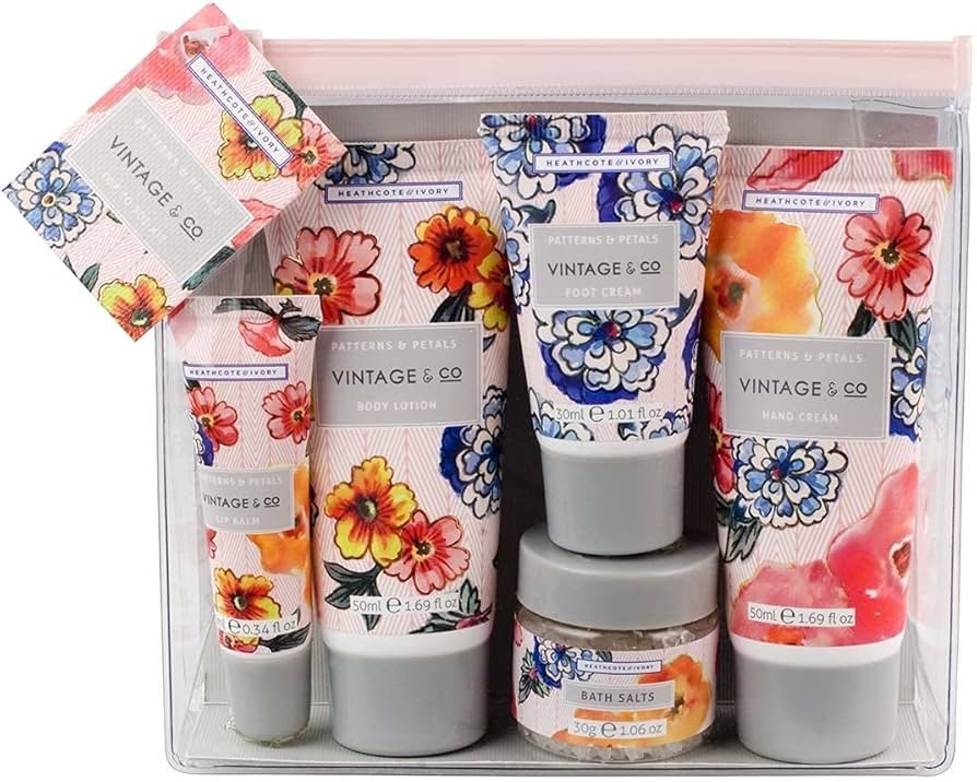 Vintage & Co Patterns & Petals Top To Toe Kit | 50ml Hand Cream, 50ml Body Lotion, 30ml Foot Cream, 10ml Lip Balm & 30g Bath Salts | Travel Friendly Sizes